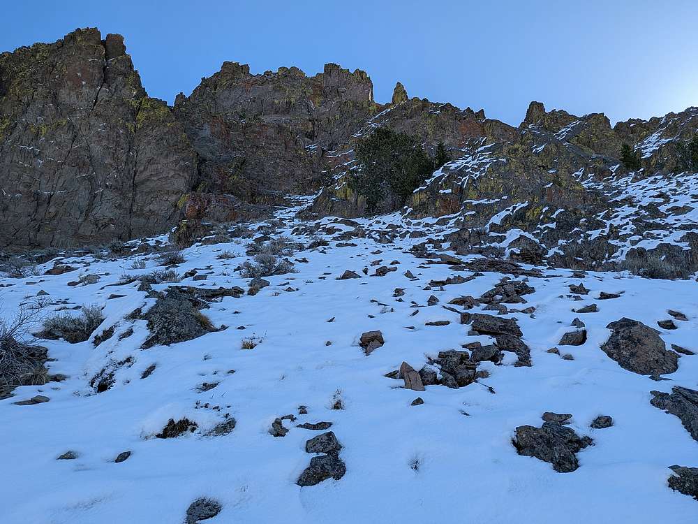 | Now in the snow on the shady side of the peak, we did manage to fine the very old trail switch backing up the talus slopes. Then at the top of the talus, we decided to attempt a scramble up the west face. |