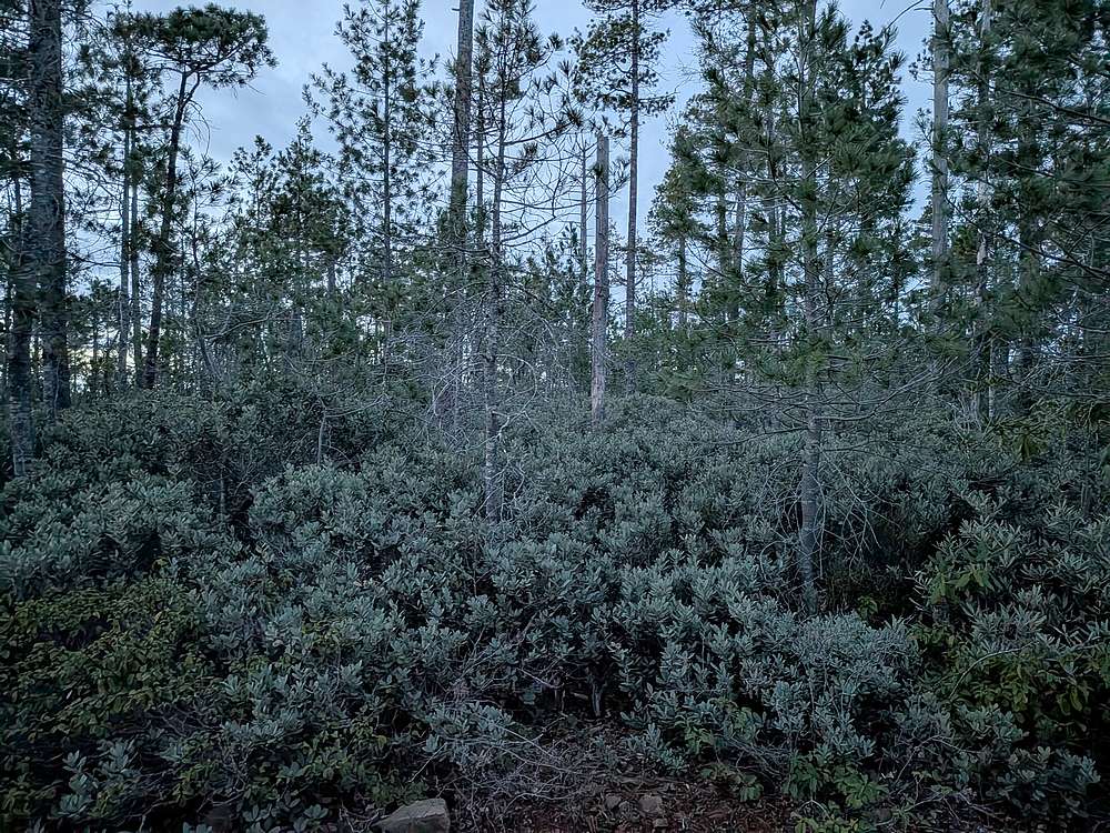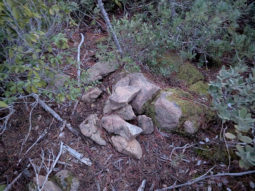 | After some searching, I found the summit cairn in the brush. |