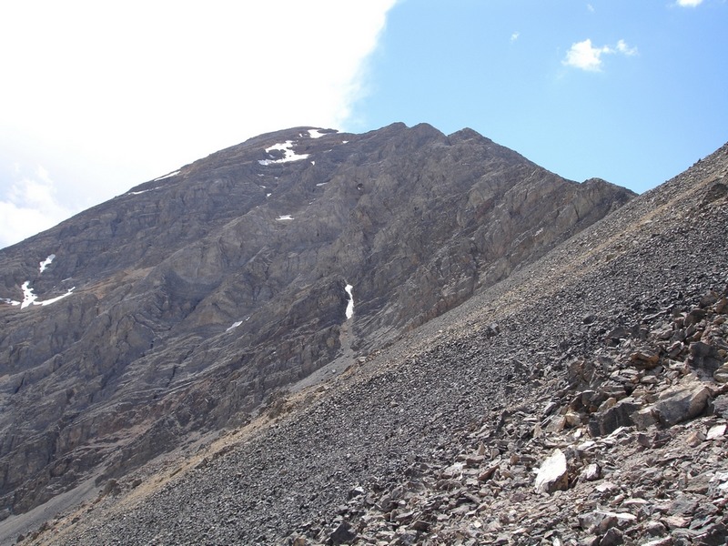 We left Boise nearly on schedule, made it to the trailhead at around 10:30 am, and were out hiking shortly after that. There had been some concern about potential thunderstorms later in the afternoon, but things looked okay from the base of the peak. Early in the hike, we made our way up wildflower covered slopes toward a grassy ridgeline at just under 9400'. From here the sketchy trail got steeper, making its way through looser rock on our way to Diamond's steep east ridge. We took a snack break at around 10200', just before the Class 3 scrambling was to begin. We had a great view of the route from here and I was starting to get excited about the climb.