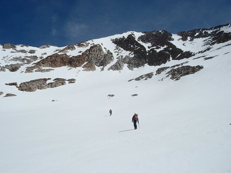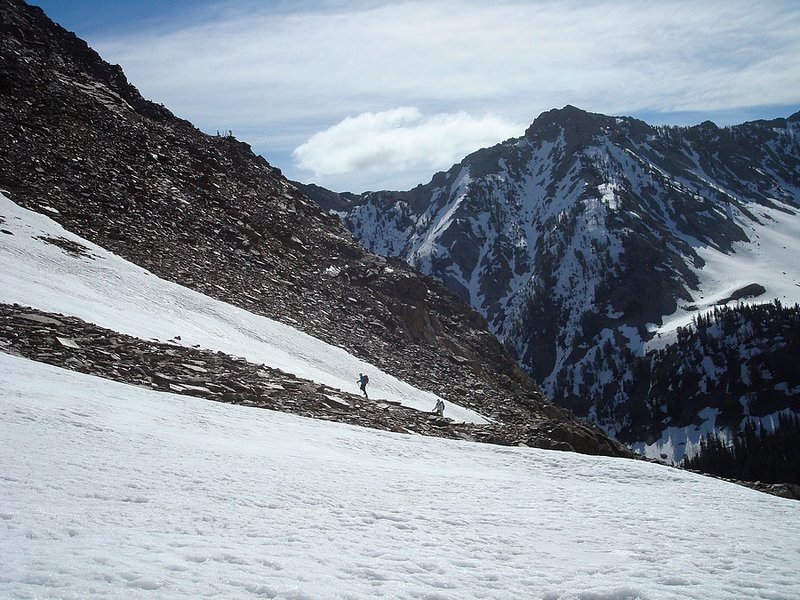 There appeared to be three snow routes to choose from to reach the summit of McIntyre. The two outer ones looked to be the gentlest, but we ended up on the steepest one the went that went "up the gut". As soon as Pat decided to go on ahead and scout out the routes, I think we all knew which option would be chosen. The "up the gut" route ended up being very cool, as we followed a twisting vein of snow until it connected to a snowfield just below the summit ridge. I'd guess the climb averaged about a 45 degree slope, and was probably just over 50 degrees at the steepest. The snow was very stable, not too hard or too soft. But the steepness and the runout below kept us alert. Once on McIntyre's summit ridge, we removed our crampons and traversed out to the highpoint. The views were spectacular, highlighted by Cobb, Hyndman, and Old Hyndman. We also had a good view of the steep south ridge of Big Basin Peak and could make out the imposing Brocky Peak to the northeast.