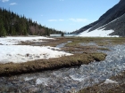 Hike to Lake 9682' - Its about 3.5 miles of cross-country hiking and 1600' of elevation gain to reach the lake. When we came here in 2005, and the hike took us quite a while due to bushwhacking. But this time we kept well above the creek to the east to stay out of the brush. We were able to follow a series of game trails for the first couple miles before crossing the creek into more open terrain, and great views of Mount Church and Badrock Peak. After crossing a few snowfields on the final section, we made it to the lake by about 7pm, where Ken and I immediately partook of some instant pudding. The lake is treeless and pretty exposed, but still a truly beautiful setting.