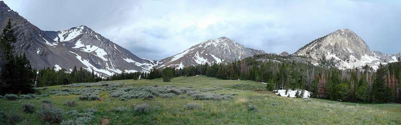 Pano taken in the upper Pahsimeroi Valley, including Leatherman Peak, Leatherman Pass, and Whitecap Peak.