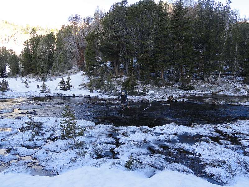 From the ridge, Pat and I studied the snow coverage down in Chamberlain Basin. After choosing our heading, we descended down off the ridge to the edge of the snowfields. It hadn't gotten as cold the prior night as we would have liked, but the snow was still firm enough to hold our weight in most areas. On we went down to the southwest corner or Lake 9477', where we made a chilly creek crossing. We located the trail at this point, but it appeared mostly snow covered, so we headed cross-country towards the base of the peak.