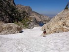 From the Baron/Moolack saddle, we still had 4 miles of mostly cross-country travel to our next planned campsite, and it was already 5:30pm. So much for an easy day. But with some amazing terrain to explore around the headwaters of Baron Creek, our spirits were still high. The initial descent east was easy on steep but loose scree. Next we followed various snowfields down through the amazing cirque with huge cliffs all around us. Photos really can’t do this area justice.