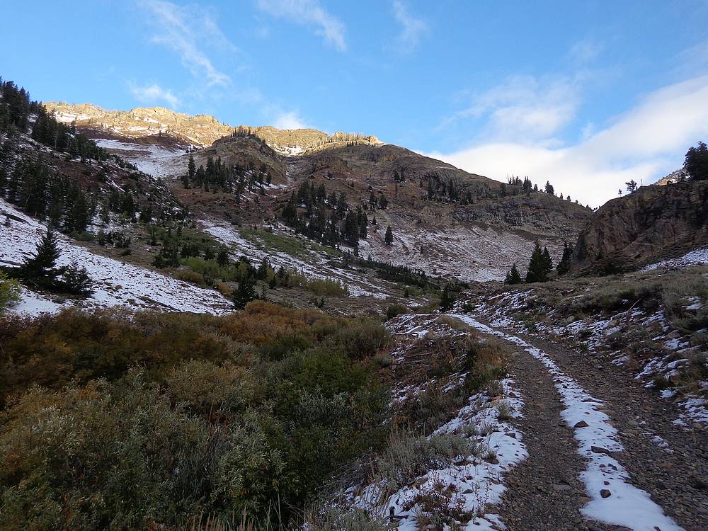 The hike starts out on an old mine road for the first 2.5 miles. Hiking in temps below freezing was a bit of shock to my lungs, and there was some thin snow to deal with, but other than that I made good time to the miner’s cabin at 9200’.