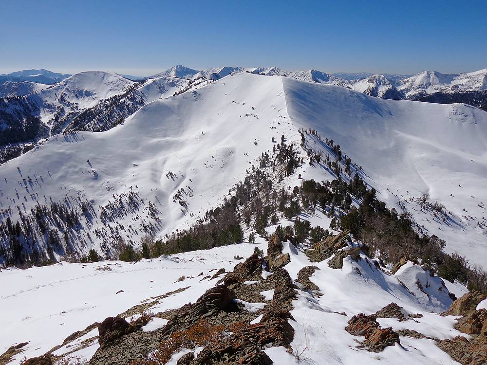 From Little Fall, I plunge-stepped down the east ridge until I reached the saddle below “Big Fall Peak” (10350’). I could see a nice game trail crossing the south face, but opted to scramble up the southwest ridge instead. There were a few awkward moves on snowy rock, but soon enough I was standing on the summit. From here, I had an in your face view of the impressive Mystery Peak to the north. I could also see Mount Borah and the full Lost River Range crest in the distance. The sky was perfectly clear, and the views always seem better when the air is cold.