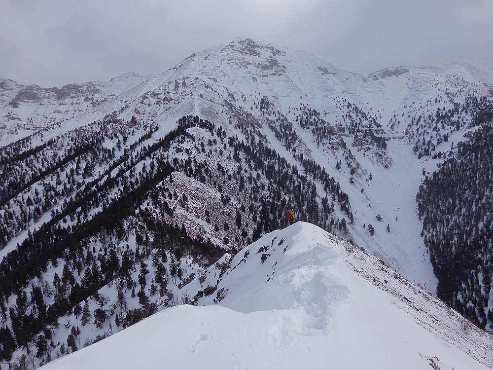 Our route took us up the snowless south facing slopes of Peak 9330’. It was steep from the start, no warm up, and we made slow but steady progress up the sagebrush and talus slopes, through some thick stands of mahogany, and then finally up the final rocky stretch to the windy highpoint. It took us just under two hours to cover the 2300’ of elevation gain to reach this first summit.