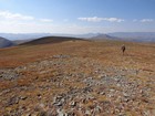 There was no warmup section for Francs, and we started immediately up a steep hillside that was a mix of grass and rocks. Once up on the ridge, we went into caution mode. Each of us was regularly hooting, hollering, or singing so as not to suddenly surprise any unsuspecting grizzly bears. Fortunately, we were well above tree line, and hoped the open terrain would make it easier to spot bears from a distance. This was mainly true, but there were spots were we crested ridges or rounded bends that were still a little spooky.