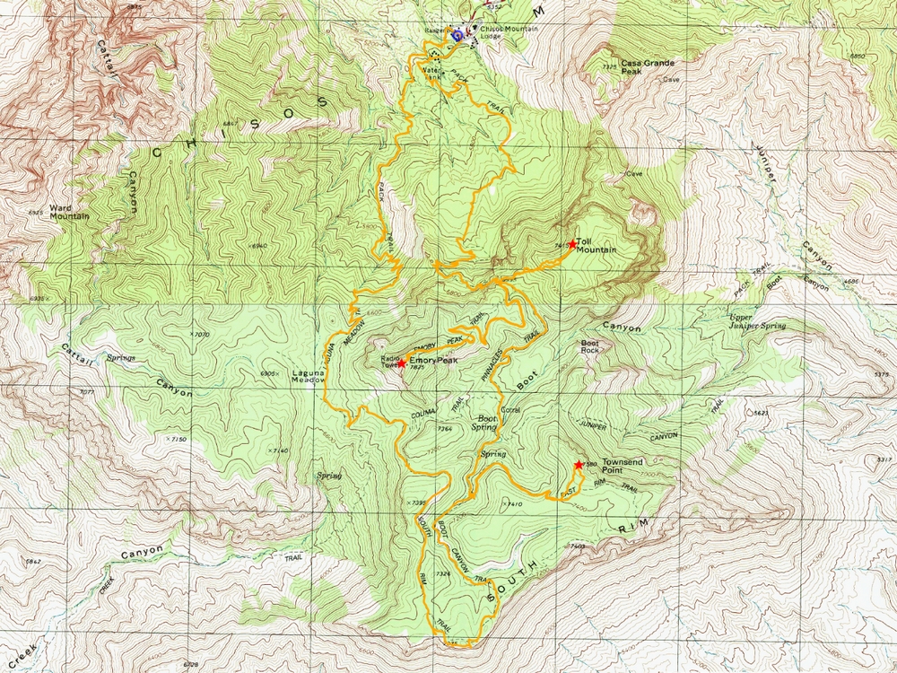 I reached the trail fork leading to the southeast rim. A portion of the trail is closed for raptor nesting season, but was open far enough to access Townsend Point. I followed the trail about a mile and a half, then bushwhacked between trees up the gentle grade to Townsend. I was even lucky enough to score some good summit views. Then it was just a matter of backtracking back to the Boot Canyon Trail, which I followed to the south rim overlook.
