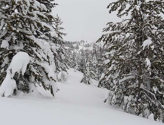 From the pullout on highway 75, I headed northwest through fresh powder and snow covered trees. It was cold and the wind was blowing, but I still warmed up quick. I followed the gentle and open southwest ridge of The Cross (9225’). Unfortunately views were minimal due to cloud cover and lightly falling snow. The summit of The Cross was windblown and corniced. I was able to see Avalanche Peak (9433’) in the distance and made a quick descent to the saddle to the north. This area was very pretty with many snow covered trees and snags dotting the landscape. I continued onward through the powder, taking the scenic route winding through the trees, staying well away from the skin tracks broken in by skiers. At one point I did see a skier making his turns coming down the ridge, the only person I saw all day.