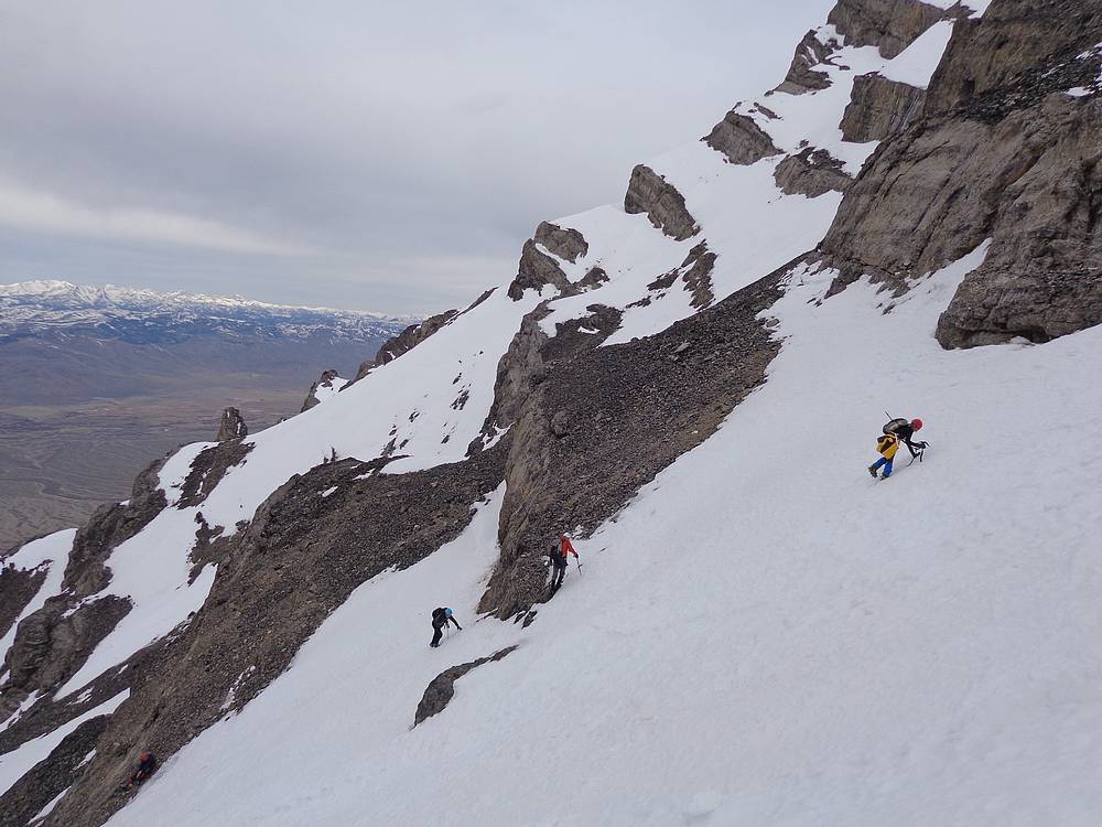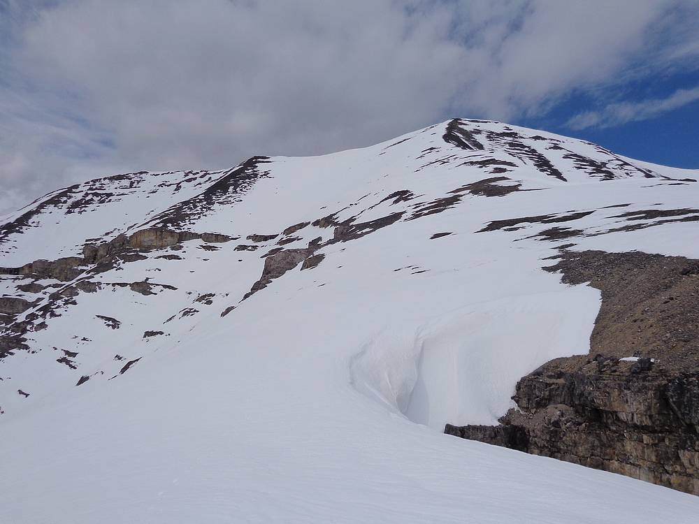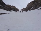 We made a good steady pace up the bottom portion of the gully. But as we entered the “stadium of the gods”, we began a steady diet of post-holing, even crawling on all fours at times to try and stay on top of the snow. This section was a lot of work, but eventually the snow got more firm higher up, and we made our way up the steep snowfield at the top of the gully.