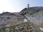 After setting up the tent, and having our customary cheese quesadilla supper, we went out exploring. The trail heading south gave us a neat view looking down into the North Fork of Baron Creek. And we also saw a really funky snowmelt pond surrounded by a gravel covered snowfield. My best guess is a landslide had covered the snow earlier in the year, and now it was melting out.