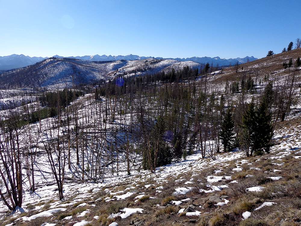 At the trailhead, there were a few inches of snow on the ground, left over from a big storm earlier in the week. I followed hunter’s boot tracks heading east from the trailhead. I did my best to stay above the burned deadfall that clogged to valley near the headwaters of Fisher Creek, but it was unavoidable. After circling around until I was due north of the peak, I crossed the valley and started the uphill hiking in earnest.