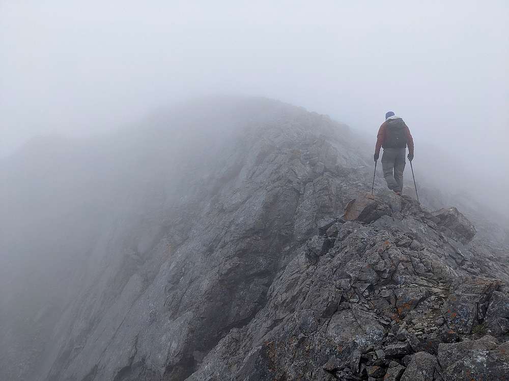 No major obstacles on the way up the west side of Rocky Mountain. Maybe a couple scramble moves, and some grunt work. Here's Michael climbing into the fog on the final section below the summit.