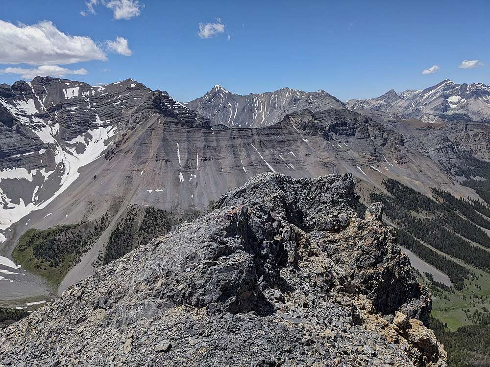 The middle summit is just slightly higher than the north summit, shown here. Cleft Peak in the distance, True Grit to the right.