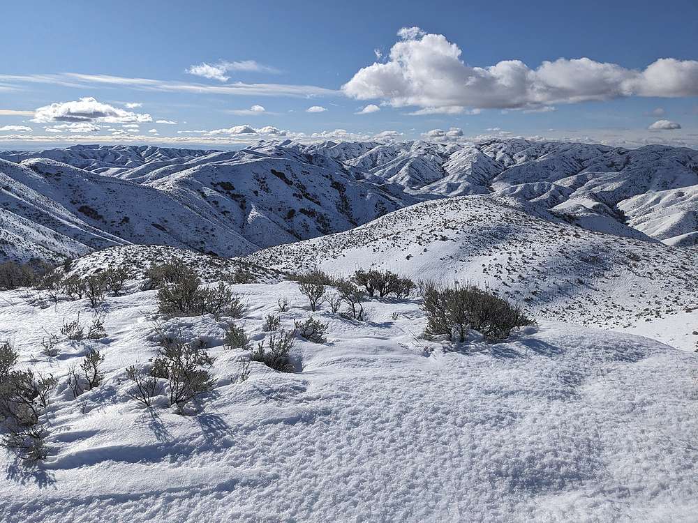 The Danskin Mountains are a sub-range of the Boise Mountains, located south of the South Fork Boise River. They are a nice option close to Boise. Station Peak and Deep Peak are accessed from the Woodtick Creek trailhead, just north of Blacks Creek Summit. There’s and old jeep road that follows along the ridge and connects the peaks making for a straightforward hike or snowshoe outing with great open views along the way. Be aware the route passes through private property that is currently open to the public, so please tread lightly.