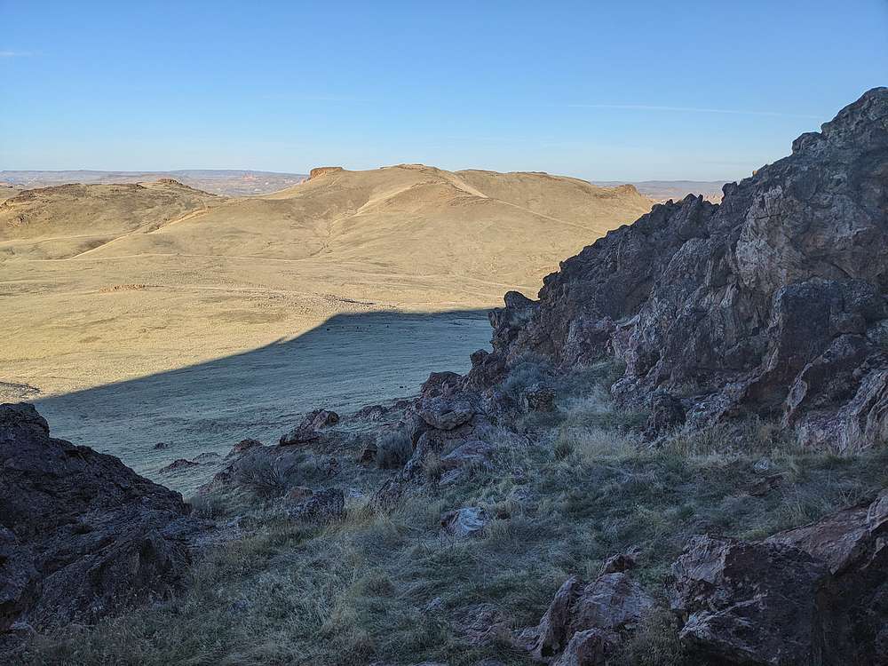 Atkins Butte involved a short scramble up a basalt incline just below the summit. From the highpoint, I had a good view toward the Honeycombs, with Long Gulch below.