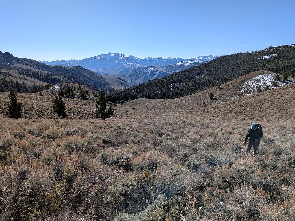 | Here we are ~7800', having left the trail for some sagebrush hiking. Bowery & Sheep Peaks in the background. |