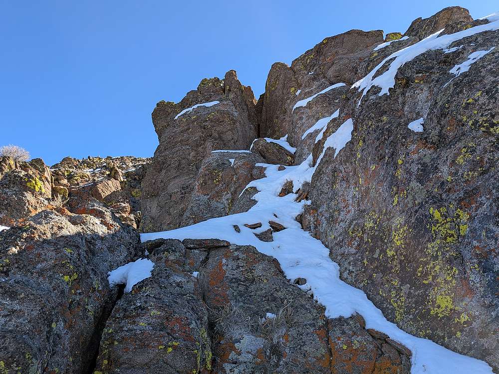 | Now in the snow on the shady side of the peak, we did manage to fine the very old trail switch backing up the talus slopes. Then at the top of the talus, we decided to attempt a scramble up the west face. |