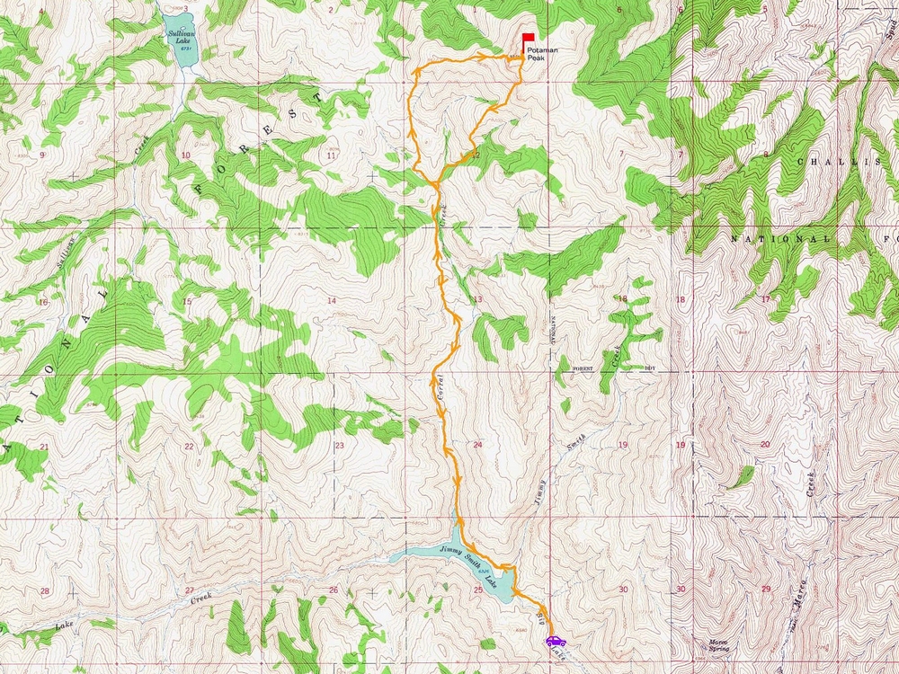 Potaman Peak is located toward the northeast corner of central Idaho’s White Cloud Mountains. This area of the range is volcanic rock, and tends to be drier, making a good early or late season option. There are several approach options, with the most straightforward being to follow the trail from Jimmy Smith Lake. The peak was formerly home to a fire lookout, and as expected has impressive and expansive views in all directions.