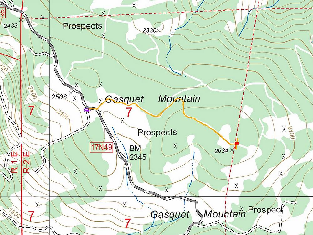 Gasquet Mountain is located in the Klamath Mountains of northern California. Named for the nearby town of Gasquet, and located not for from Crescent City. A well graded road leads to the start of the hike, with another side road making for a sporting hike to near the summit. Only the final 20 yards requires some bushwhacking to reach the highpoint.