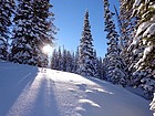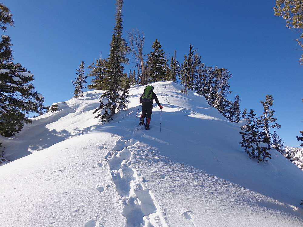The sun was sinking fast, and even though the cold was bearable in the sun with no wind, we knew we needed to be back to the car before dark, when the temperature would drop quickly. We had some discussion about alternate routes back to the car that might be faster, but ultimately decided to retrace our steps on the way down. Turns out, heading downhill in a broken trail is much easier than grinding our way uphill through fresh powder. Needless to say, we made pretty good time. The only thing that slowed us down was breaks to check out the amazing scenery all around us.